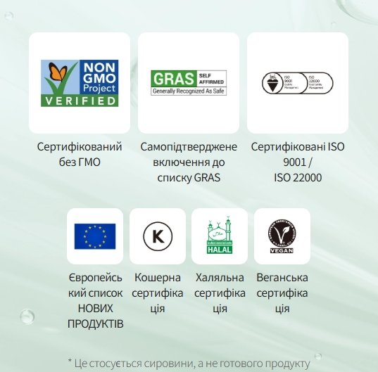 - сертифікована сировина: Non-GMO, Kosher, Halal, Vegan