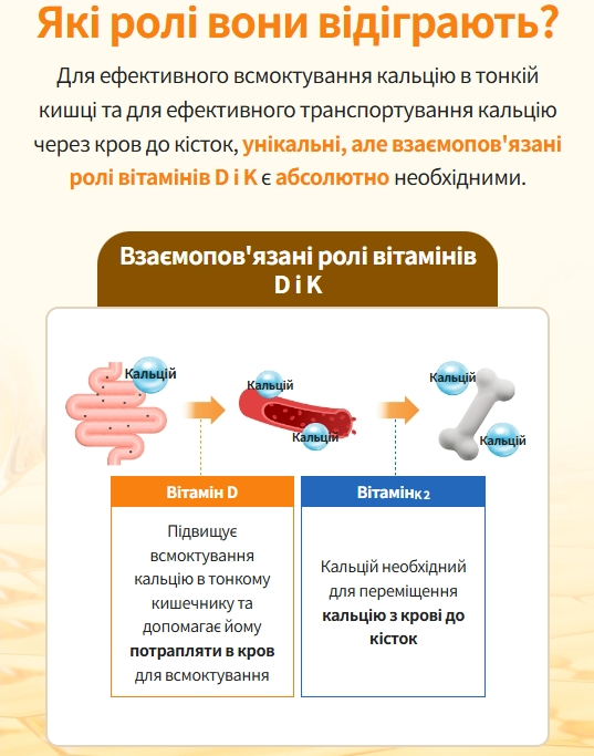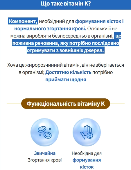 - Вітамін K2 (MK-7) — допомагає направляти кальцій у кістки та зуби для їх зміцнення