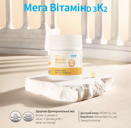 ✅ Atomy Mega Vitamin D3 K2 — це поєднання двох важливих вітамінів для підтримки здорових кісток, імунітету та активного способу життя.